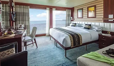 52 个精心布置的客舱中仅可容纳 96 名客人。所有客房均享有海景,配有私人设施、空调、吹风机、Wi-Fi 连接和用于移动设备的 USB 端口。她异常灵活和机动性强,吃水浅,可以近距离观察,所有公共空间都有绝佳的视野,宽敞的露天观景台,此外还配有最先进的探索工具,包括玻璃底船、水下摄像机、视频显微镜、皮划艇和立式桨板。